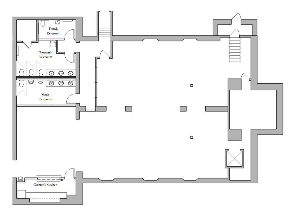 Once the structural issue is resolved, the lower-level will receive all new flooring and ceiling tiles, as well as an overall refresh of the walls. The entire space will be opened up by removing the center wall and replacing it will be a gallery of columns to facilitate unity in gatherings. The bathroom facilities will be expanded, including larger women’s and men’s bathrooms and a new dedicated family bathroom will be provided. To accommodate social events, a new caterer’s kitchen will be installed.