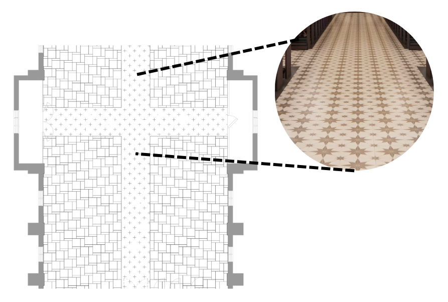 The flooring running between the pews and up the main aisle, will be a patterned ceramic tile. Under the pews there will be a simplified tile. It will not only be more aesthetically pleasing to replace the carpet; it is also practical, as it removes a potential hazard.